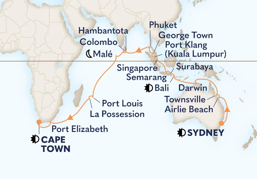 Departing from Sydney’s shimmering harbor, this 40-day segment of the world cruise journeys to Australia, Indonesia, Thailand, Mauritius, and beyond. Stay overnight in Bali and Cape Town.