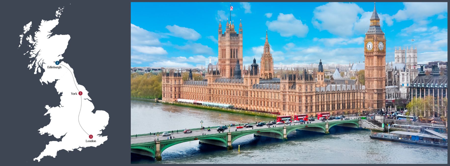 Experience three of Britain’s most iconic cities — London, York, and Edinburgh — each with a relaxed three-night stay in exceptional 5-star accommodations. Travel in style aboard First-Class rail as you journey through art, history, and countryside charm. Highlights include the Tate Britain, Windsor Castle, York Minster, a private tour of Castle Howard, and afternoon tea on a river cruise. With seamless travel, curated experiences, and refined comfort throughout, this tour is the perfect blend of culture and luxury.